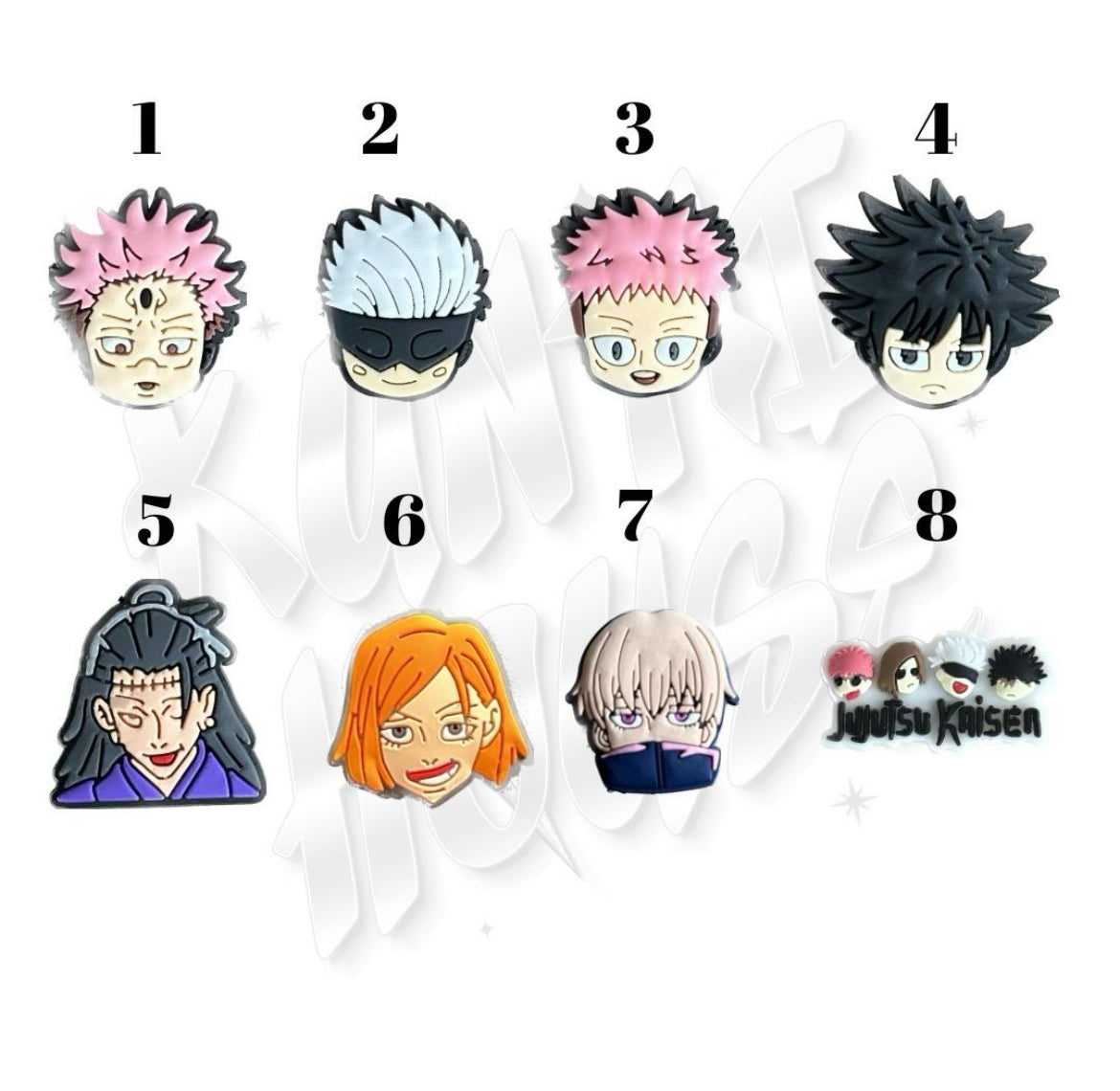 Medium Bundle: 3 small jjk keychains, 2 medium jjk keychains, and 5 croc charms.